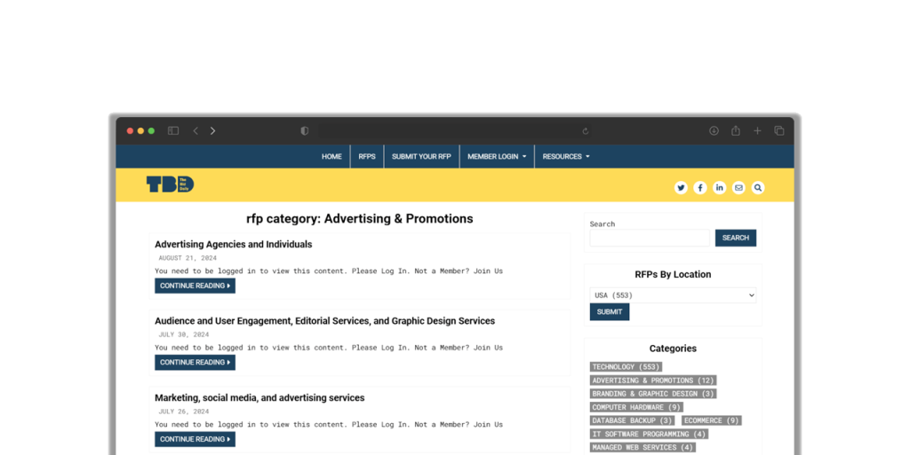 The Bid Daily provides a free tool for governments, public organizations, local municipalities, city and state agencies, non-profit organizations, and private companies to effortlessly publish their technology requests for proposals (RFPs), RFQs, RFIs, and other procurement documents. This enables them to attract more competitive bids from qualified small and large vendor organizations.